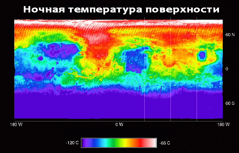 Карта, составленная из данных теплового спектрометра аппарата "Марс Глобал Сервейор" в ходе 500 облётов вокруг Марса в 2 часа ночи, показывает нам эту температуру. Температура поверхности марсианской ночью варьируется от -65 до -120°C. Самые тёплые области имеют белый цвет, а самые холодные- фиолетовый. Данные были получены когда на северном полушарии в то время было лето,”