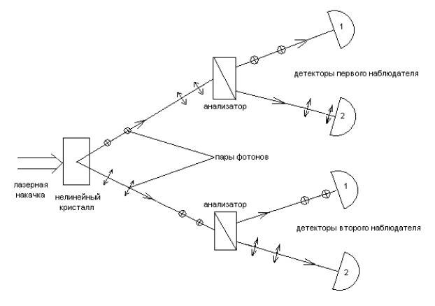 из пары может после анализатора попасть на детектор 2 первого наблюдателя, что