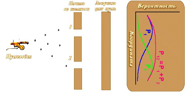 Он не очень хорош, наш пулемёт. Он выпускает пули, направление полёта которых заранее неизвестно. То ли направо они полетят, то ли налево…. Перед пулемётом стоит броневая плита, а в ней проделаны две щели, через которые пули свободно проходят. Далее стоит ²детектор² - любая ловушка, в которой застревают все попавшие в неё пули. Когда нужно, можно пересчитать число пуль, застрявших в ловушке на единицу её длины, и разделить её на полное число выпущенных пуль. Или на время стрельбы, если скорость стрельбы считать постоянной. Эту величину – число застрявших пуль на единицу длины ловушки в окрестности некоторой точки Х, отнесённое к полному числу пуль, мы будем называть вероятностью попадания пули в точку Х. Заметим, что мы можем говорить только о вероятности – ведь мы не можем сказать определённо, куда попадёт очередная пуля. Ведь пуля, даже попав в дыру, может срикошетить от её края и уйти вообще неизвестно куда. Давайте мысленно проведём три опыта: первый, когда открыта первая щель, а вторая закрыта, второй – когда открыта вторая щель, а первая закрыта. И наконец, третий опыт, когда обе щели открыты. Результат нашего первого ²эксперимента² показан на этом же рисунке, на графике. Вероятность в нём отложена вправо, а координата – это и есть положение точки X. Синяя кривая показывает распределение вероятности P1 попавших в детектор пуль при открытой первой щели, зелёная кривая – вероятность попадания в детектор пуль при открытой второй щели, и красная кривая – вероятность попадания в детектор пуль при обеих открытых щелях, которую мы обозначили P12. Сравнив величины P1, P2 и P12, мы можем сделать вывод, что вероятности просто складываются, P1