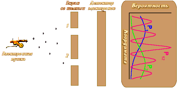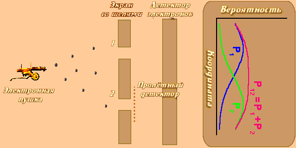 Возьмём электронную пушку, типа тех, которые стоят почти в каждом телевизоре, и поместим перед ней непрозрачный для электронов экран с двумя щелями. Прошедшие через щели электроны можно регистрировать различными методами: с помощью сцинтиллирующего экрана, попадание электрона на который вызывает вспышку света, фотоплёнки или с помощью счётчиков различных типов, например, счётчика Гейгера. Результаты измерений для электронов в случае, когда одна из щелей закрыта, выглядят вполне разумно и весьма походят на наш опыт с пулемётной стрельбой (синяя и зелёная кривая на рисунке). А вот для случая, когда обе щели открыты, мы получаем совершенно неожиданную кривую P12, показанную красным цветом. Она явным образом не совпадает с суммой P1 и P2! Получившуюся картину называют интерференционной картиной от двух щелей. Давайте попробуем разобраться, в чём тут дело. Если мы исходим из гипотезы, что электрон проходит либо через щель 1, либо через щель 2, то в случае двух открытых щелей мы должны получить сумму эффектов от одной и другой щели, как это имело место в опыте с пулемётной стрельбой. Вероятности независимых событий складываются, и в этом случае мы бы получили P1 + P2 = P12. Во избежание недоразумений отметим, что графики отражают вероятность попадания электрона, прошедшего через одну или обе щели, в то или иное место детектора. В пределах статистической погрешности они не чувствительны к полному числу зарегистрированных частиц. Может, мы не учли какой-нибудь существенный эффект, и суперпозиция состояний (то есть одновременное прохождение электрона через две щели) здесь совсем ни при чём? Может быть, у нас очень мощный поток электронов, и разные электроны, проходя через разные щели, как-то искажают движение друг друга? Для проверки этой гипотезы надо модернизировать электронную пушку так, чтобы электроны вылетали из неё достаточно редко. Скажем, не чаще, чем раз в полчаса. За это время каждый электрон уж точно пролетит всё расстояние от пушки до детектора и будет зарегистрирован. Так что никакого взаимного влияния летящих электронов друг на друга уж точно не будет! Сказано – сделано. Мы модернизировали электронную пушку и полгода провели возле установки, проводя эксперимент и набирая необходимую статистику. Каков же результат? Он ничуть не изменился. Но, может быть, электроны каким-то образом блуждают от отверстия к отверстию и только потом достигают детектора? Это объяснение также не проходит: на кривой P12 при двух открытых щелях есть точки, в которые попадает значительно меньше электронов, чем при любой из открытых щелей. И наоборот, есть точки, вероятность попадания электронов в которые более чем вдвое превышает вероятность попадания электронов, прошедших из каждой щели по отдельности. Стало быть, утверждение о том, что электроны проходят либо сквозь щель 1, либо сквозь щель 2, неверно. Они проходят через обе щели одновременно. И очень простой математический аппарат, описывающий такой процесс, даёт абсолютно точное согласие с экспериментом, с тем, что показано красной линией на графике. Чем же отличаются пули от электронов? С точки зрения квантовой механики, ничем. Только, как показывают расчёты, интерференционная картина от рассеяния пуль характеризуется столь узкими максимумами и минимумами, что никакой детектор их зарегистрировать не