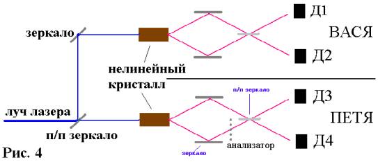 Лазерный луч с помощью полупрозрачного зеркала расщеплялся на два пучка, а затем каждый из пучков направлялся на так называемый нелинейный кристалл, способный расщеплять квант света (фотон) на два дочерних кванта. Закон сохранения энергии при этом, конечно же, выполняется: энергия каждого из дочерних квантов вдвое меньше энергии материнского кванта. Например, если падает луч лазера с длиной волны 405 нм (синего цвета), то на выходе из кристалла будут два луча с длиной волны 810 нм (красного цвета), энергия каждого кванта которых вдвое меньше энергии кванта в исходном луче. Затем с помощью системы зеркал делалось так, что каждая из этих двух пар фотонов интерферировала между собой, примерно так, как интерферировали компоненты суперпозиции в нашем опыте с рассеянием электронов на двух щелях. Результаты наблюдения интерференционной картины фиксировались детекторами Д1-Д2 для первой пары фотонов, и детекторами Д3-Д4 – для второй пары. Как известно, любая частица, обладающая ненулевым