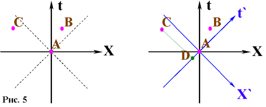 одновременно с событием C в системе отсчёта ракеты) лежит до события A. То есть в