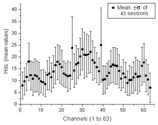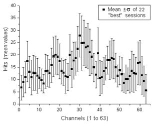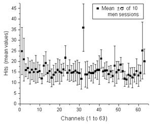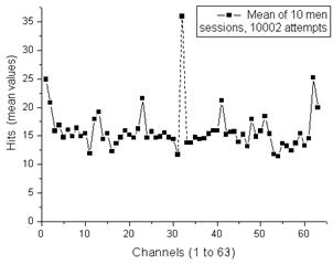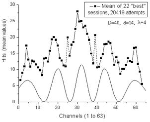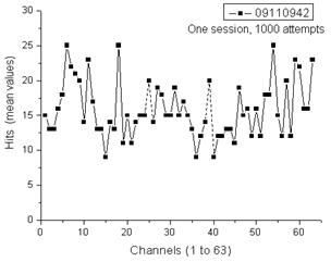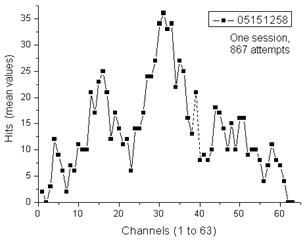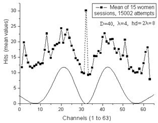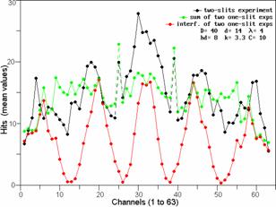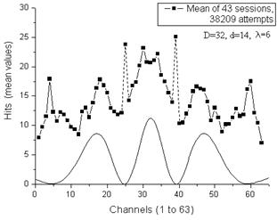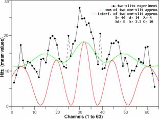 На Рис. 3 и 4 представлены результаты (средние значения) двухщелевого эксперимента с людьми. Всего участвовало 26 испытуемых (23 женщины и 3 мужчины) проделавших в 43 сессиях 38209 попыток . В распределениях отчётливо проявляется волновая компонента, контраст центральных пиков превышает 35% . Можно предполагать и наличие более тонкой структуры. Положение щелей соответствует каналам 25 и 39. Им на распределениях соответствуют острые пики (показаны пунктиром). Повидимому это артефакты связанные с потерей концентрации в моменты расслабления, когда испытуемый перестаёт контролировать "частицу".