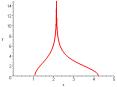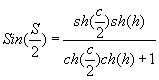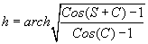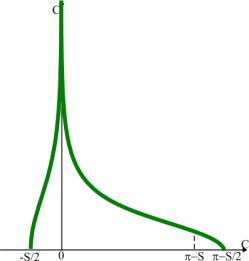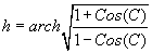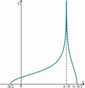 знакоположительное решение. Точки разрыва: С=(2n+1)p-S; Точка перехода: С=pn-S/2 Рис.4. Зависимость длины основания гиперболического треугольника (с) от угла вершины С для треугольников. Первая регистрационная проекция предельной фигуры. Действительное знакоположительное решение. Точка излома: С=(2n-1)p Точка перехода: С=pn-S/2 Если первая проекция ассоциируется с основанием треугольника, то вторая, ортогональная проекция, будет ассоциироваться с его высотой (h). Находим выражение зависимости величины высоты (h) равнобедренного треугольника площади S на плоскости Лобачевского от угла при вершине (С):