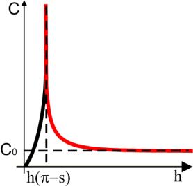 Рис.5. Зависимость длины высоты гиперболического треугольника (h) от угла вершины С для треугольников. Вторая регистрационная проекция предельной фигуры. Мнимое знакоположительное решение. Точки разрыва: С=2pn; Точка перехода: С=pn-S/2 Рис.6. Зависимость длины высоты гиперболического треугольника (h) от угла вершины С для треугольников. Вторая регистрационная проекция предельной фигуры. Действительное знакоположительное решение. Точка излома: С=2np - S Точка перехода: С=pn-S/2 Первоначально наибольший интерес представляют инварианты абсолютно предельного треугольника S=p. Получаем: