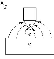 Штерна-Герлаха Магнитное поле создается между двумя магнитными полюсами, один из которых плоский, а другой – сильно заостренный. В результате напряженность магнитного поля возрастает у острого полюса и уменьшается у плоского. Частицы пропускаются между магнитными полюсами перпендикулярно плоскости рисунка, в месте, помеченном «крестиком». Энергия