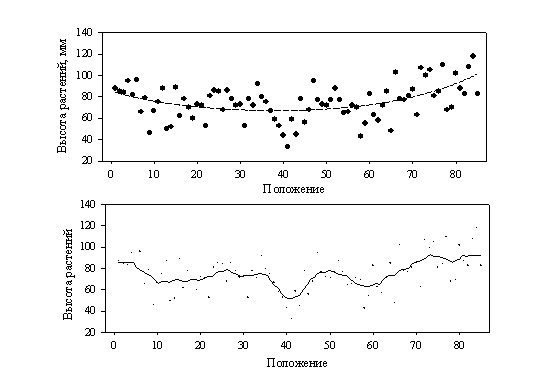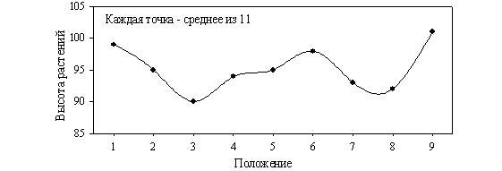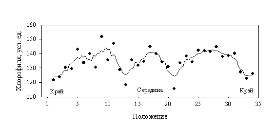 сосудах, расположенных вплотную друг к другу по прямой линии (рис. 5). Растения выращивались в темноте, чтобы исключить их взаимодействие через фитохром (система, регулирующая рост и развитие растений посредством рецепции слабого красного и .дальне-красного света). Эксперименты с выращиванием растений в отдельных сосудах исключают также взаимодействия растений через корневые системы. Тем не менее, в этих опытах наблюдается четкая зависимость высоты растений от положения в пространстве посева, особенно хорошо выраженная в форме краевого эффекта.