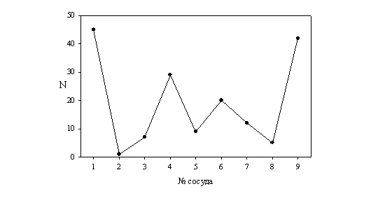 Всего было проделано 45 таких опытов. Бюксы не помечались, и каждый раз располагались в случайном порядке. На рис. 11 представлен спектр распределения бюксов по числу случаев, когда объем воды в них был ниже, чем в соседних,, подтверждающая выявленную пространственную закономерность, аналогичную для биологических процессов, описанных выше. Подобные опыты были также проделаны для бюксов с водой, расположенных по окружности, внешний диаметр которой составлял 18 см. 15 бюксов заполняли одинаковым количеством (10 мл) дистиллированной воды и оставляли незакрытыми на несколько суток.