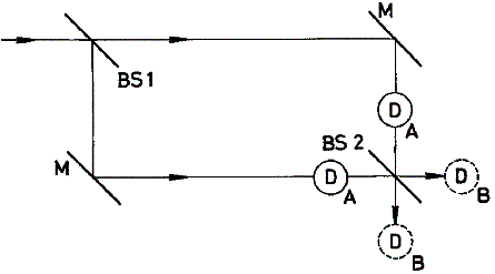 Рис.1. Интерферометр Маха-Цендера (BS1, BS2 – расщепители луча (beamsplitters); M - зеркала; D - детекторы). Метками A и B отмечены альтернативные позиции детекторов. Когда в эксперименте Юнга (Young’s) известно, каким путем двигался фотон,