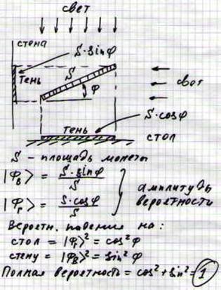 Асперяна. Что является вероятностью выпадения некоторого результата при подбрасывании монеты в самом общем случае? Очевидно, что падение монеты – это и есть наблюдаемое событие, но насколько оно является общим? Следует предположить, что при подбрасывании двух монет они касаются стола не одновременно. Вряд ли это может вызвать возражение. Но тогда для фиксации результата выпадения второй монеты мы должны придумать какой-то другой механизм. Видимо, монета при регистрации не успела занять окончательное, плоское положение на поверхности стола. Странно звучит? Да, конечно. Но ещё более странным должно звучать предположение о том, что два измерителя в этом эксперименте – столы не обязаны быть параллельными! Такое расположение столов является, по существу, более общим случаем эксперимента. Исходя из приведенных доводов, разумно рассматривать вообще любой случай «измерения» монеты в самом широком смысле: положение монеты в момент касания стола. Ясно, что монета чаще всего в момент регистрации образует со столом некоторый угол, обозначим его буквой φ. Что в таком случае является вероятностью выпадения этого результата? Если считать, что единичной вероятностью, то есть достоверностью, является падение монеты «плашмя», то, видимо, вероятностью падения, то есть, «приземления» монеты под углом φ является вероятность, пропорциональная этому углу. Эта величина, как видно из рисунка, фактически пропорциональна площади «тени», отбрасываемой монетой на крышку стола, то есть величине произведения площади монеты на косинус угла φ между монетой и столом. Казалось бы, всё так. Но здесь есть небольшая неточность. Величина тени на самом деле не является вероятностью в «чистом виде». Эта величина, как нетрудно увидеть, фактически является вектором состояния монеты. А, как известно, вероятностью выпадения результата является не сам вектор состояния, а его квадрат. То есть квадрат вектора состояния, который принято называть амплитудой вероятности, и является вероятностью выпадения соответствующего результата: Я думаю, что