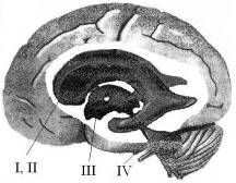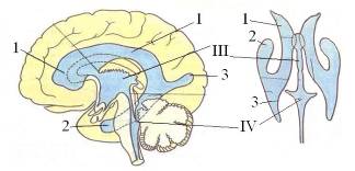 Рис.1. Схемы расположения и формы желудочков ликвора I (левый), II (правый) – боковые, III – центральный,  IV – четвертый; 1, 2, 3 – передние (лобные),  нижние (височные) и задние (затылочные) рога боковых желудочков.