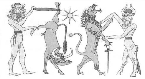 Рис.2. Символика солнечных энергоформ электромагнитной природы (пара – человек и перевернутый бык) и гибридной нейтрино-магнитной энергоформы (пара – лев и человеко-бык).