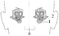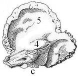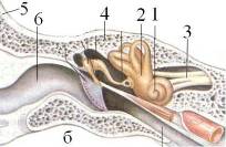 Рис.7. Схема расположения органов слуха и полукружных каналов вестибулярного аппарата (2) в относительно оси лица (а) и в кости черепа человека (б, с). 1 – улитка; 3 – слуховой нерв; 4 – пирамида каменистой части височной кости; 5 – височная кость; 6 – наружный слуховой проход [27, 30].