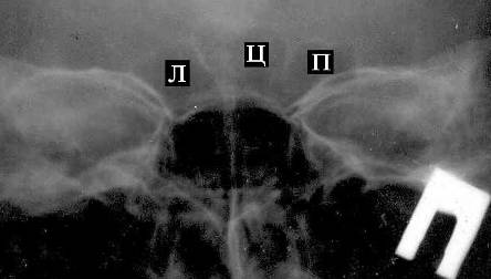 Рис.8. Рентгеновский снимок лобных пазух. Л, Ц, П – левый, центральный и правый лепестки.