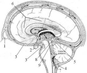 Рис.9. Цистерны, пазухи и структуры мозга.   1 – лобная пазуха, 2 – гипофиз, 3 – цистерна основания мозга (базальная), 4 – мозжечково-мостовая цестерна, 5 – цистерна червя, 6 – межполушарная цистерна, 7 – отверстие Мажанди, 8 – эпифиз, 9 – четверохолмие.