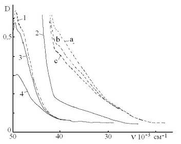 Рис.1. Спектры поглощения воды разной степени чистоты (спектрофотометр Specord M-40). 1 – водопроводная вода  (толщина слоя d = 0,5 см) и a – та же вода (d = 5 см), b – та же вода после 5 мин облучения УФ-светом  лампы ПРК-4, c – после 20 мин облучения; 2 – вода из колодца Амвросия (d = 0,2 см); 3 – вода Milli RO (d = 1 см); 4 – вода Milli Q (d = 5 см).