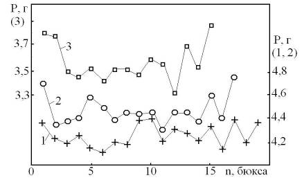 Рис.2. Вес испарившейся воды (1, 3) и спирта (2) из бюксов ( Æ = 2 см, h = 3 см), линии которых ориентированы с востока на запад. 1 – водопроводная вода выстоянная сутки, время испарения t = 10 суток; 2 – этанол, t = 4 суток; 3 – вода + сахар (40%), t = 7 суток.