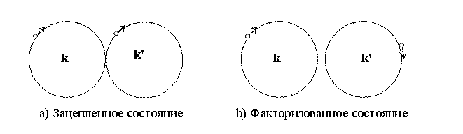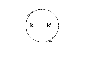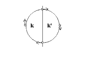 Фотон с равной амплитудой пребывает в пространственных модах k и  k' (Рис.2). Эти моды  должны быть различимы физически. Состояния  не различимы, так как мы не знаем в какой моде находится фотон. Условием интерференции по Фейнману, как раз и является принципиальное отсутствие у наблюдателя информации о том в какой моде находится фотон. Благодаря этому и образуется суперпозиция. В нашей квазимеханистической интерпретации это состояние можно представить следующей схемой: