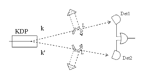 Фотоны могут пройти прямо к детекторам (короткий путь), либо зайти внутрь "трамбонных" линий задержки (длинный путь). Заметим, что, хотя, эти линии задержки и сами по себе являются интерферометрами, в условиях эксперимента, интерференция на них не наблюдается из-за низкой когерентности света. Дело в том, что при параметрическом рождении пары сохраняется энергия фонов накачки Е=Е1+Е2, но энергия каждого из фотонов совершенно неопределенна.