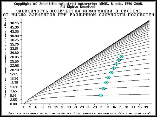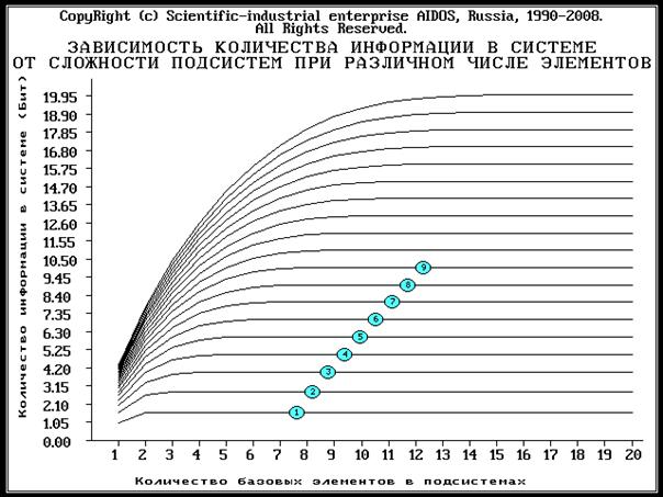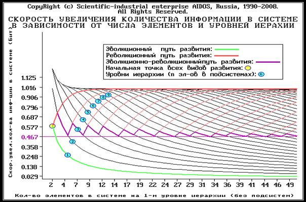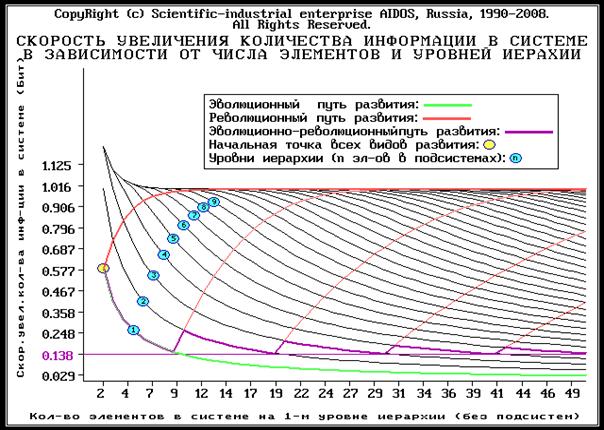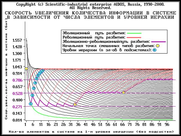 эволюционный путь развития, мощность и сложность 50). Рассмотрим 1-ю кривую, изображающую скорость увеличения объема информации в системе с одним уровнем иерархии, т.е. просто множества. Видно, что эта скорость довольно быстро уменьшается при росте системы и при 9 элементах достигает порогового значения 0,138 Бит/элемент. Из-за низкой скорости увеличения объема информации дальнейший количественный рост системы теряет смысл и система преобразуется качественно, т.е. усложняется и у нее появляется 2-й уровень иерархии. Это сразу приводит к возрастанию скорости увеличения объема информации до 0,248 Бит/элемент в системе, которая начинает опять количественно расти до тех пор, пока эта скорость опять не снижается до порогового значения. И так далее... На рисунке 16 выбрано довольно низкое пороговое значение, а на рисунках 17 и 18 более высокие.