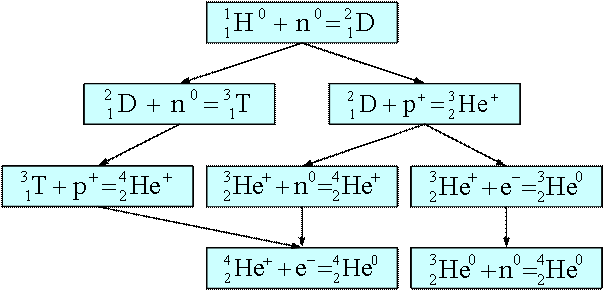 Из этого примера мы видим, что атом гелия образуется из атома водорода не непосредственно, а через последовательность ядерных и химических реакций, причем возможны различные пути получения одного и того же результата. На рисунке 20 показаны некоторые из этих путей: