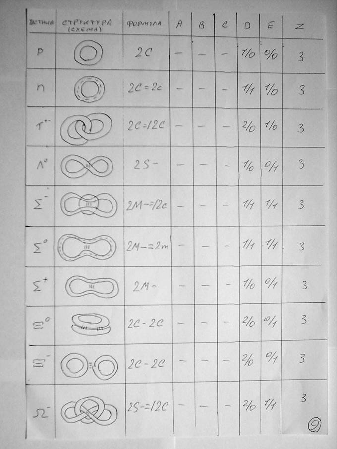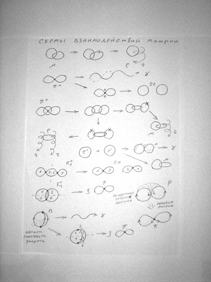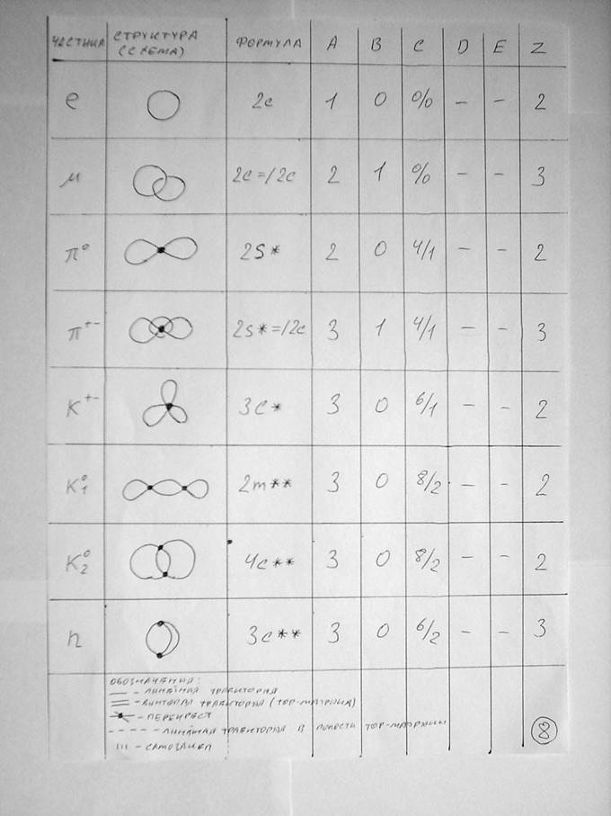 ЧАСТИЦЫ) В качестве характеристик структур и выполнения принципа запрета, я введу три числовых характеристики (все характеристики положительны и целочислены) для лептонов и мезонов: A(количество окружностей). Окружность - плоскость замкнутая траекторией или, иначе говоря "дырка", связанность окружности траектории (например, для круга A=1,для восьмерки A=2). B(количество сцепок). Сцепка представляет собой взаимодействие двух замкнутых траекторий, при котором невозможно их разделение без разрыва одной из замкнутых траекторий, подобное сцеплению звеньев металлической цепи. Сцепка является единственным и основным взаимодействием матриц. C(характеристика перекреста). Перекрест представляет собой геометрическое пересечение двух и более траекторий. Характеризуется количеством усов (входящих и выходящих частей траекторий в перекресте) и количеством перекрестов в структуре, которые в указанном порядке записываются числителем и знаменателем дроби-значения C. Z(пространственность). Соответственно, принадлежность траектории к n-мерности пространства: 0-мерное Z=0 (точка), 1-мерное Z=1 (прямая), 2-мерное Z=2 (плоскость), 3-мерное Z=3 (объем). Структуру нуклонов и гиперонов характеризуют иные величины: D(количество окружностей)=дробью с числителем – тор-матричные окружности, знаменатель - линейные окружности. E(сцепки и зацепы)=дробь с числителем -количество сцепок, знаменатель -зацепы. Из приведенных ранее частиц: покоящаяся первочастица A=0,B=0,C=0/0,Z=0; поле взаимодействий A=0,B=0,C=0/0,Z=1; фотон A=0,B=0,C=0/0,Z=2; нейтрино A=0,B=0,C=0/0,Z=3. Показатели согласованные с принципом запрета: A < 3,B < 1. ДЛИТЕЛЬНОСТЬ СУЩЕСТВОВАНИЯ ЭЛЕМЕНТОВ МАТРИЦ: Время существования структуры определяется временем существования наиболее короткоживущего элемента. Время жизни элементов матриц: Стабилизация тороидальным каналом линейной траектории, 1011с. Сцепка линейных траекторий, 10-6с. c-матрица (электрон не относится), 10-8с. Зацеп тор-матриц, 10-10с (вероятно является сильным взаимодействием) s,m-матрица, 10-11с. Самозацеп торматрицы, 10-11с. Сцепка двух тор-матриц, 10-13с. Перекрест, 10-17с. Трехусый перекрест (высокоасимметричный), 10-19с. Нарушение принципа запрета (не зарядового), 10-22с. ГЕОМЕТРИЧЕСКАЯ (МАТРИЧНАЯ) СТРУКТУРА ЭЛЕМЕНТАРНЫХ ЧАСТИЦ: ЭЛЕКТРОН представлен линейной траекторией в форме круга на плоскости. Заряд определяется единственной плоскостью вращения. Максимально возможная энергоемкость траектории равна 0,51 МэВ. Кольцевой вариант траектории –наиболее простейший, вероятно поэтому электрон стабилен или условно стабилен. Круговые траектории в иных частицах, по сравнению с электроном энергоперегружены и потому нестабильны. Определение заряда: направление вращения в единственной плоскости, существуют заряды "+" и "-". Характеристика:A=1,B=0,C=0/0,Z=2. МЮ-МЕЗОН представляет собой две круговых (электронные) траектории в симметричной сцепке. Связка способствует повышению энергоемкости в сравнении с простой круговой траекторией (электрон) до 52 МэВ. Определение заряда: определяется по одной из двух равноценных плоскостей - избранной плоскости и подобно электрону существуют заряды "+" и "-". Время жизни определяется временем существования сцепки линейных траекторий. Характеристика:A=2,B=1,C=0/0,Z=3. ПИ-НУЛЬ-МЕЗОН имеет форму лемнискаты, и состоит из двух s-матриц с одним перекрестом. Траектория лежит в плоскости, но в