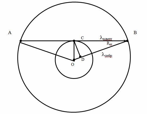 где DB – классический радиус электрона, OB- длина волны де Бройля электрона, CB – длина волны Комптона электрона. Примечательно то, что перемещение электрона от точки С до точки В vt равно длине волны Комптона электрона. Если время было бы вариантным, как предлагают Эйнштейн и его последователи, то скорость электрона v принимала бы любые значения, что противоречит опыту и квантовой механике, согласно которым величины характеризующие движение электрона в атоме принимают только разрешённые значения. Кроме того, из этого следует также, что на окружности, радиусом которой является длина волны де Бройля, должно укладываться целое число длин волны Комптона частицы, т.е. Rде Бр= n λk или v = c/n Инверсия, сохраняя единство времени, даёт также другое понимание сокращения длины. В данном случае это отображение длины волны де Бройля R0 в R, т.е. как таковое сокращение длины отсутствует. Радиус R назовём радиусом Лоренца. Рассмотрим