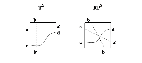 Одной из проблем космологии является вопрос о топологии пространства-времени Вселенной, как четырехмерного многообразия. Легко видеть, что проективная, гиперповерхность  (арена субъективной физической реальности)  должна быть неориентируемой. Это следует из известной теоремы о том, что любое проективное пространство RP(n) четной размерности n неориентируемо [11].  Действительно, рассматриваемая в предыдущем параграфе проекция объективного многообразия (в пятимерном пространстве ) представляет собой четырехмерное неориентируемое многообразие RP(4), подобно тому, как проективный образ двухмерного компактного многообразия дает проективную плоскость RP(2) (лист Мебиуса без края). Мы предполагаем, что геометрия, генерирующая группу Лоренца и рассмотренная в предыдущем параграфе, справедлива лишь локально, тогда как, глобально многообразие  гомеоморфно тору , вложенному в .  К сожалению, гомотопические типы четырёхмерных компактных топологических многообразий  пока не достаточно изучены. Известно только, что в случае компактной и односвязной поверхности  работает аналог гипотезы Пуанкаре (М. Фридман, 1982г).  Но это нам ничего не дает, поскольку, по всей видимости, модель Вселенной не может быть односвязной. Тем не менее, между всеми  проективными пространствами есть много общего. Так для них фундаментальная группа[4] равна  (Понятно, что ). Поэтому,  [16]. Здесь - группа чисел по модулю 2. К тому же все четномерные проективные пространства неориентируемы. Первое означает то, что на это пространство не может "намотаться" более одного витка траектории не  "соскальзывая". Для наглядности приведем пример 2-х мерных многообразий с аналогичными свойствами. На тор можно намотать либо по меридианам, либо по параллелям какое угодно целое число витков. Это означает, что его фундаментальная группа . Здесь - группа целых чисел (квантование?). На сферу невозможно намотать ни одного витка, так как любая петля стягивается в точку (соскальзывает). Соответственно ее фундаментальная группа тривиальна . А вот проективные пространства занимают промежуточное место в такой классификации – с них "соскальзывает" только каждый второй виток! Это можно легко показать на примере пространства  (проективной плоскости). На рис. 3 справа показана модель проективного пространства  в виде квадрата. Противоположные стороны отождествлены с переворотом на π.  Для сравнения слева модель тора . В этом случае стороны отождествлены без переворота.