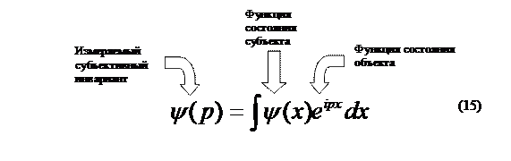 Любая конечная система в классической механике описывается счетным числом степеней свободы, зависящим только от числа частиц. Например (без потери общности будем рассматривать одну координату), точечная материальная частица описывается одной координатой, одним импульсом и временем. То есть систему, содержащую 1 частицу можно охарактеризовать 3-мя числами.  В квантовой механике даже одна частица занимает в фазовом пространстве конечный несжимаемый объем. Формально состояние  можно связать преобразованием Фурье с координатной функцией . О чем говорит такое представление? И почему имеет место именно такая связь? В рассматриваемом контексте эта структура имеет простую интерпретацию.  Согласно принципу 2,  Мир в целом – периодический процесс. Любая его подсистема, в частности сам наблюдатель и изучаемые им объекты, так же описываются периодическими функциями. Если вычислить свертку по какому-либо параметру функций наблюдателя (субъекта) и объекта, то мы получим некий инвариант по этому параметру.