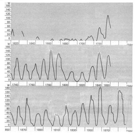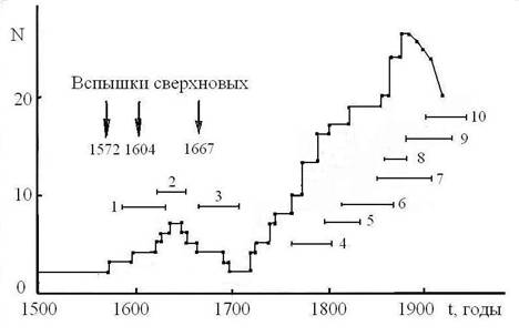 Распределение выдающихся физиков в истории, прежде всего, зависит от физических факторов инициирующих рождение талантливого человека, а затем активирующих его мозг в процессе творчества. Таким образом, суммарное число живших в одно и тоже время великих физиков (N) можно считать пропорциональным интенсивности потока (IN) биогенного излучения ответственного за рождение и деятельность человека правши с доминантным левым полушарием. Для выяснения природы IN проверили корреляцию распределения N с ходом изменения во времени различных физических и социальных факторов. Из анализа Рис. 1 следует, что распределение имеет пороговый характер, то есть до 1550 года физики как доказательной науки практически не существовало, и в нем наблюдаются два максимума – 1640 и 1880 гг. В распределении не проявился характерный для солнечной активности период в 11 лет. Кроме того, известно, что в период с 1645 по 1715 год (период Маундера) солнечная активность была минимальна (Рис. 2). Но именно в это время жили Галилей, Декарт и Ньютон. В период низкой солнечной активности 1800 -1835 гг. (Рис 2) наблюдался рост числа N. Отсюда можно предположить, что природа IN напрямую не связана с электромагнитной энергетикой Солнца. Рис.1. Гистограмма распределения численности великих физиков по времени. Отрезками показано время творческой деятельности, начиная с 20-ти летнего возраста, следующих физиков: 1 – Декарт; 2 – Галилей; 3 – Ньютон; 4 – Кулон; 5 – Ампер; 6 – Фарадей; 7 – Кельвин; 8 – Максвелл; 9 – Планк; 10 – Эйнштейн. Стрелками показано время наблюдения на Земле вспышек сверхновых. В принципе, распределение N во времени должно соотноситься с динамикой населения в Европе (Рис 3), однако последняя в период 1500 – 1800 гг. сама могла в какой-то степени зависеть от IN. Вообще, с действием IN в данный период времени следует связать духовные особенности «эпохи просвещения». К ним относятся помимо зарождения физики и раскола в русском православии (1666 г.) скачкообразный расцвет сферы искусств и гуманитарных наук, в том числе математики и философии. Пороговый характер распределения N и его спады в районе 1700 и после 1900 гг. при монотонности роста численности населения Европы указывают на неоднозначность зависимости числа N от общей численности населения. Следует также отметить тот факт, что при снижении рождаемости в период общеевропейской Тридцатилетней войны (1618 – 1648) число N напротив возросло. Кроме того, темп роста N на отрезке 1710 – 1800 гг. почти на порядок выше темпа роста населения. Таким образом, с помощью физических солнечно-планетарных и социальных факторов трудно объяснить наблюдающееся распределение N и духовные особенности эпохи просвещения. Учитывая, что начало данной эпохи ознаменовано тремя вспышками сверхновых звезд, разумно предположить, что природа IN связана с физикой этих уникальных явлений галактического масштаба. Рис. 2. Характеристика пиков солнечной активности, выраженная в числах Вольфа [8]. Взрывы сверхновых, да еще в нашей Галактике явление редкое и в силу этого практически не изученное. Помимо двух визуально зафиксированных вспышек 1572 (Тихо Браге) и 1604 (Кеплер) годов исторические хроники сообщают о наблюдении еще только одной вспышки сверхновой в 1054 году. Рис. 3. Предположительная динамика населения Европы в 1500 – 1800 гг. [9] Что касается вспышки третьей сверхновой в созвездии Кас