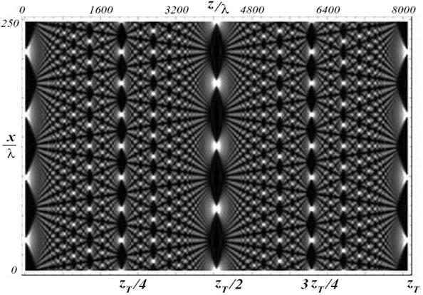 Подпись: Рисунок 3. Талбот-ковер как результат интерференции монохроматического света на экране, имеющего четыре щели. Длина Талбота zT=2d2/λ. Рисунок захвачен с http://en.wikipedia.org/wiki/Talbot_effect .