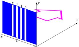Интерференционный эксперимент. Экран содержит четыре узкие щели, прорезанные по оси y. Ширина щели и расстояние между щелями соизмеримы с длиной волны частицы. Волновой пакет рассыпается по оси x, по мере того как он сдвигается в область, указанную розовой стрелкой в направлении z.