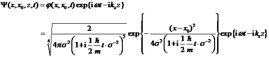Скорость вдоль оси z есть vz = pz/m = kz/m. Это позволяет выразить в последующем параметр t через отношение zz, т.е., сдвиг по координате z, с точностью до делителя νz, эмулирует время t. По этой причине, в дальнейшем в волновой функции Ψ(x,x0,z,t) будем опускать написание аргумента t.