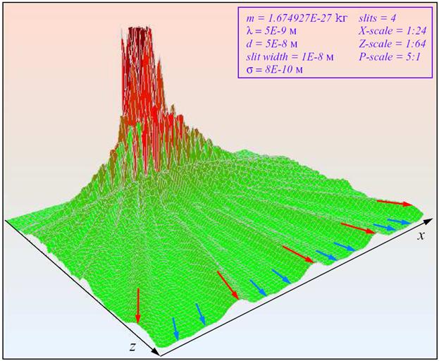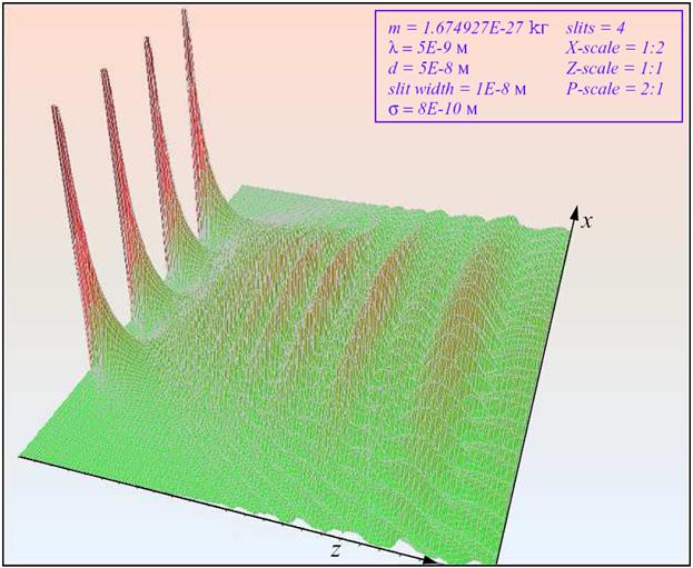 Здесь моделируется рассеяние нейтронов на такой щелевой конструкции. Входные параметры: m = 1.674927´10-27 кг– масса покоя нейтрона, l = 5´10-9 м– длина волны нейтрона, расстояние между щелями  d = 5´10-8 м, а параметр s  = 8´10-10 м. Нейтроны в данной симуляции являются ультрахолодными, T = E / kB  0.38K [13]. При таких экстра низких температурах может быть получено хорошее разрешение нано-масштабов.