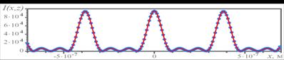 Подпись: Рисунок 6. Дифракция в дальней зоне. Синие кружки относятся к показанному на Рис. 5 паттерну, красная линия - результат расчета по формуле (1) с параметрами I0 и z , приведенных в статье [3].