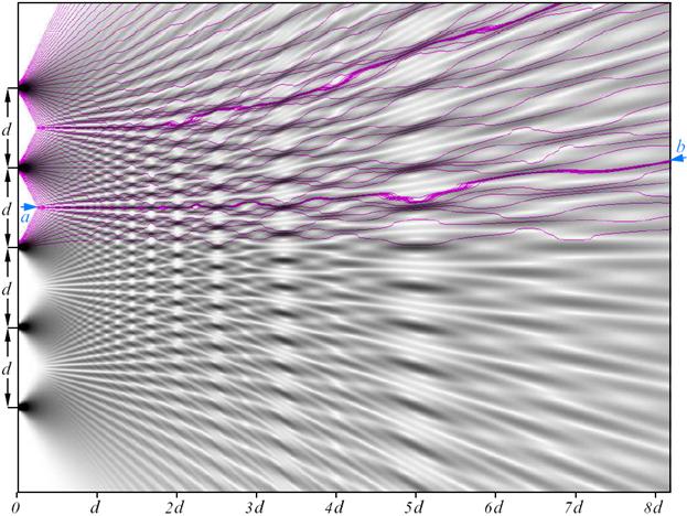Фиолетовые волнистые кривые, прорисованные в верхней части рисунка, являются кривыми, представляющими ход бомовских траекторий – траекторий, удовлетворяющих принципу наименьшего действия. Прежде всего, следует обратить внимание, как и каким образом фиолетовые кривые заполняют пространство интерференционного паттерна. Они предпочитают группироваться в тех областях, где плотность вероятности показывает возвышенности (на рисунке этому соответствуют затемнения). И фиолетовые кривые избегают просветленных участков – участков, на которых плотность вероятности имеет провалы. В темных областях фиолетовые кривые проявляют тенденцию выстраиваться радиально, т.е., в параллель с ориентацией затемненных участков. А если имеет место пересечение светлых областей (вызванные, например, перетеканием из одной затемненной области к другой), то такие пересечения имеют тенденцию выстраиваться азимутально, т.е., тенденция к перпендикулярной ориентации по отношению к светлым участкам. При этом надо заметить, все бомовские траектории не пересекаются друг с другом.