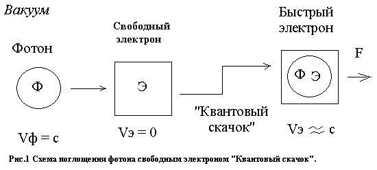 у свободных электронов. Конечный результат "квантовых скачков" свободных электронов это образование "бета - излучения". Название "бета-лучи", исторически присвоено одному из видов радиоактивных излучений, которое, как потом выяснилось, представляет собой быстрые электроны. Энергия электронов этого излучения не имеет фиксированного значения [3]. Проведем мысленный эксперимент. Поместим свободный и неподвижный электрон в некую идеальную среду, например абсолютный вакуум, и направим на него фотон. Очевидно, что неподвижный электрон поглотит фотон, и за счет энергии фотона электрон начнет двигаться в пространстве, при этом его скорость приблизительно будет равняться скорости фотона. Рис.1. То, что электрон поглотит фотон это очевидно, так как это одно из свойств электрона. Последующее изменение скорости или энергии электрона есть ничто иное как «квантовый скачок» свободного электрона - скачок, который всегда следует после поглощения фотона электроном. Конечно предложенная схема «квантового скачка» электрона очень идеализирована, так как для того, чтобы электрон стал из преимущественно корпускулы преимущественно волной он должен поглотить достаточно большое количество фотонов [4]. Также нужно четко понимать разницу между «солнечным парусом» и «квантовым двигателем». Солнечный парус поглощает и преобразовывает в поступательное движение весьма незначительный импульс фотона и игнорирует достаточно большую энергию фотонов. Квантовый же двигатель наоборот поглощает энергию фотона и преобразовывает ее в движение. При этом импульс фотона практически игнорируется. Преобразование импульса фотона в механическую энергию электрона описывается формулой 1.[5] Vф*Mэ=Vэ(Mэ+Mф), (1) где: Vф – скорость фотона; Vэ – скорость электрона после соударения; Mф – чистая масса фотона; Mэ – чистая масса электрона. Формулу же, описывающую преобразование энергии фотона в механическую энергию электрона, предстоит еще разработать если эффект экспериментально будет подтвержден. Понятно,