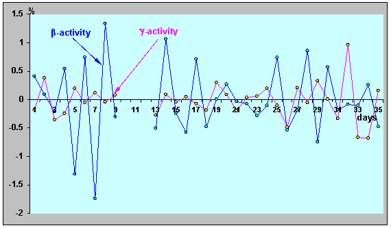 Подтверждением справедливости предположения о гармоническом характере колебательного процесса, отображением которого являются временные зависимости β-активности могут служить и фрагменты характеристик β-активности ИИИ № 5 и № 25 в рассматриваемых периодах (рис. 20-21), а также характеристики относительной β-активности ИИИ № 6, № 10, № 25 для других, более продолжительных (от 7 до 11 мес.), временных периодов, рис. 20-24. Рисунок