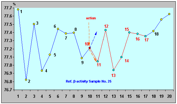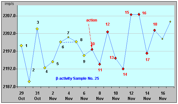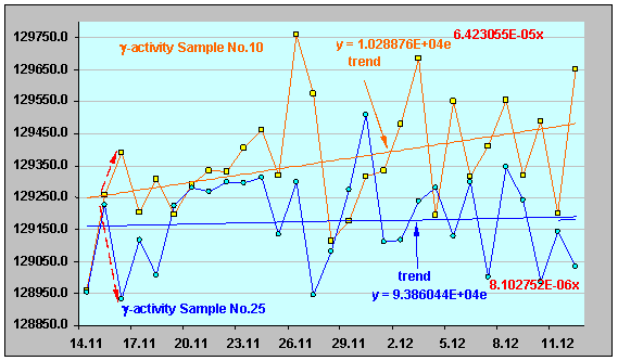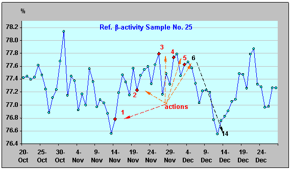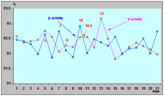 γ-активности ИИИ №25. Взаимосвязь между процессами, определяющими конкретный вид характеристик β- и γ-излучения, наиболее отчетливо иллюстрируют графики, рис. 3, 4. Здесь явно просматривается период предварительного «накопления потенциала» β- излучения (точки 7 - 13, рис. 3), с последующим его «преобразованием» (характерный спад уровня – точки 13 – 14 и далее), и «проявлением», через определенный промежуток времени, - уже в виде максимума интенсивности γ-излучения (точка 15, рис. 4). Рисунок 3. Относительная β-активность