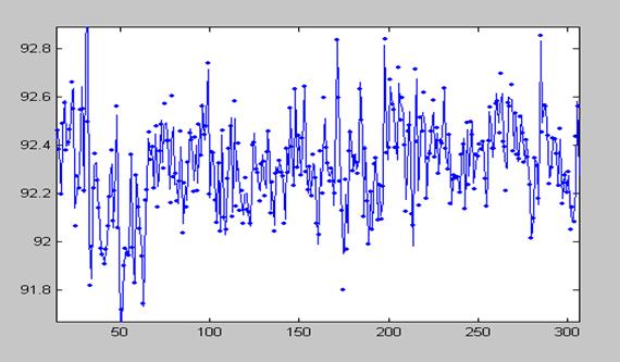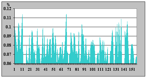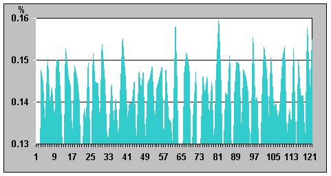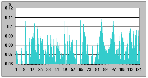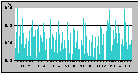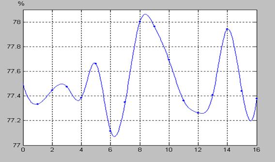 Необходимо подчеркнуть, что полученные в данной работе результаты измерений, характеризующие динамику интенсивности излучения ИИИ, с формальной точки зрения представляют собой последовательности чисел, определенных в промежутки времени с постоянным шагом. Такие зависимости одной величины от другой полностью подпадают под определение дискретных сигналов. «В наиболее общей формулировке сигнал – это зависимость одной величины от другой (т.е. с математической точки зрения сигнал является функцией)» [3]. «Дискретные сигналы имеют ряд фиксированных уровней представления некоторых параметров. Чаще всего используются сигналы дискретные по времени, т.е представленные в определенные моменты времени. Сигналы, мгновенные значения которых представлены числами, принято называть цифровыми сигналами» [4]. Таким образом, можно считать, что полученные последовательности чисел отображают некоторые функции, связанные с процессами, формирующими состояние радиоактивного вещества. Рассматривая под таким углом графики временной зависимости относительной β-активности (подобные у всех ИИИ), можно прийти к выводу, что по виду они напоминают характеристики, типичные для сигналов с угловой модуляцией. При таком подходе временную зависимость относительной β-активности ИИИ можно интерпретировать как сигнал с частотно-фазовой модуляцией, где роль частотно-модулирующего сигнала играет некий внешний фактор, имеющий определенную частоту, а фазовая модуляция у фиксируемого (наблюдаемого) «сигнала» такого, как относительная β-активность, появляется как результат перемножения двух частотно-модулированных сигналов, каковыми выступают временные зависимости β-активности исследуемого и контрольного ИИИ № 5. (Относительная активность - есть отношение значений интенсивности изучаемого и контрольного ИИИ). При этом важно отметить, что сам модулирующий сигнал в характеристике относительной β-активности ИИИ никак не проявлен, поскольку это – именно отношение (а не произведение) двух сигналов, промодулированных по частоте одним и тем же сигналом, а может быть проявлен только в характеристике β-активности конкретного ИИИ. В качестве подтверждения допустимости такой трактовки полученных экспериментальных результатов исследований временных характеристик β-активности ИИИ, можно привести фрагменты характеристик относительной β-активности ИИИ № 25 (в обычном виде и с использованием сплайнов), а также их производных (приращений уровня интенсивности), в различных временных периодах – рис. 10 - 15.