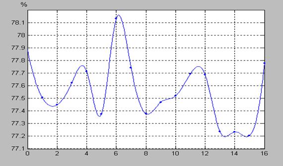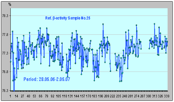 β-активности ИИИ №25 (18.08.06 - 29.08.06). Убедительным доказательством того, что относительная β-активность представляет собой сигнал с фазовой модуляцией, является приводимая ниже сводка измеренных в разное время максимальных значений относительной интенсивности β-излучения ИИИ № 25: - 31 июля 2006 г. - 77,96525%; - 14 декабря 2006 г. - 78,07032%; - 4 апреля - 31 октября Эти, периодически повторяющиеся экстремумы с практически неизменной амплитудой, представляют собой отношение максимума интенсивности β-излучения ИИИ №25 к минимуму интенсивности β-излучения ИИИ № 5, т.е. точки с фазовым сдвигом между этими колебаниями, равным 180°. (Приведенная сводка результатов, помимо всего прочего, является также и подтверждением достигнутых высоких метрологических характеристик процесса измерений параметров активности ИИИ). Наличие у характеристик, рис. 13–15, отмеченных особенностей - «нулевых» приращений амплитуды, говорит об отсутствии в этот период частотной модуляции «подсистем, рождающих β-излучение» обоих ИИИ, т.е. о прекращении воздействия на эти «подсистемы» некоего внешнего фактора. А