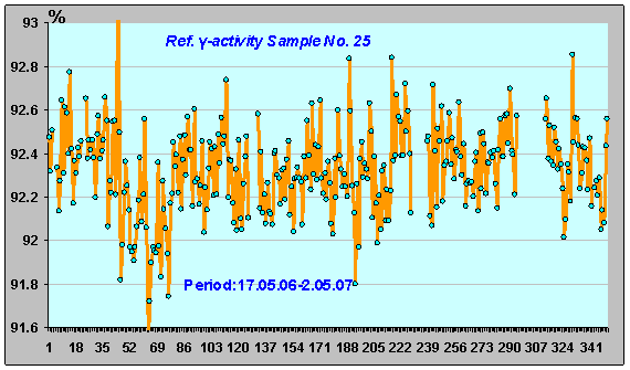 Рисунок 27. Динамика относительной γ-активность ИИИ №25 в годичном цикле. (17.05.06 - 2.05.07). Чтобы понять причину такого характера динамики γ-активности достаточно вспомнить отмеченное ранее (рис. 5) воспроизведение хода временной зависимости относительной β-активности на характеристике относительной γ-активности, с временным сдвигом между характерными зонами (экстремумами). Таким образом, анализ представленных результатов исследований динамики активности ИИИ позволяет сделать вывод о том, что причиной выявленного колебательного характера как β-, так и γ-излучения ИИИ является модуляция процесса «β-распада» (137Cs --> 137mBa) и последующего преобразования (137mBa --> Ba) воздействием обнаруженного «внешнего фактора». Однако, поскольку эти два процесса происходят в различных средах и имеют различную природу, то их параметры будут отличаться друг от друга. (Процессы, известные, как «β-распад», относятся к категории взаимодействий, происходящих на «информационном уровне», в то время, как преобразования в ядрах атомов (порождающие γ-излучение), происходят на ином - «трансмутационном уровне», относящимся к следующему, более низкому уровню в структуре Мироздания, а это – разные «среды» и различающиеся процессы. Поэтому процессы, определяющие динамику γ-излучения, проходящие в материальной среде, являются более инерционными и, следовательно, периоды у них будут иными, что хорошо заметно при сравнении графиков относительной активности – рис.28 и 29 (28а и 29а).
