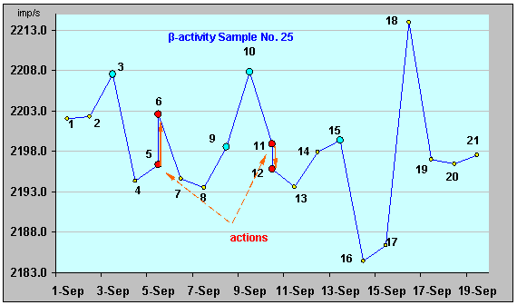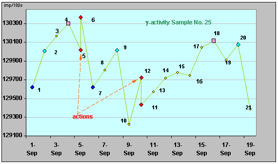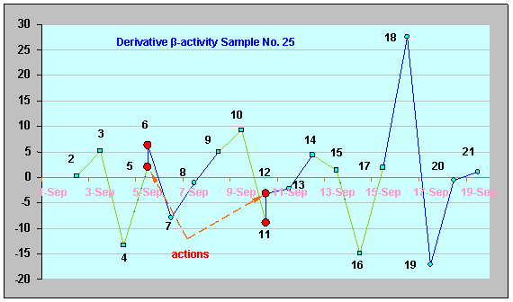 β-активности ИИИ №25 (1.09.06-19.09.06). Воздействия. На характеристике γ-активности ИИИ № 25 (рис. 33) также хорошо видны результаты воздействий - сдвиг участков на 6 суток после первого воздействия: точки 1-2 --> 7-9 (отличие значений интенсивности γ-излучения в точках 2-9 составляет 0,00607 %, а в точках 1-7 значения равны), и итоговый сдвиг – 10 суток: точки 9-20 (8.09.06-18.09.06); отличие значений интенсивности в этих точках 0,0477%.