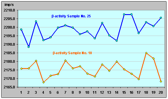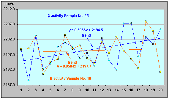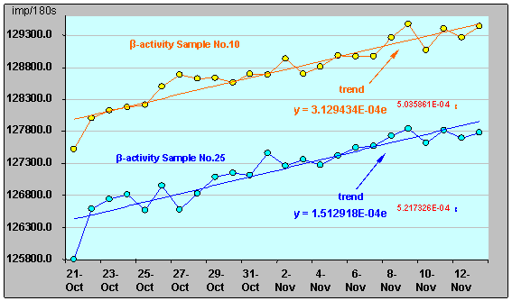 Рисунок 38. Относительная β-активность ИИИ №25 (20.10.07 - 28.12.07). На рис. 39 представлено сравнение характеристик β-активности ИИИ № 25 и ИИИ №10 (на который не оказывалось воздействий), где можно ясно увидеть различия в динамике β-активности этих двух ИИИ. Рисунок 39. Сравнение характеристик β-активности