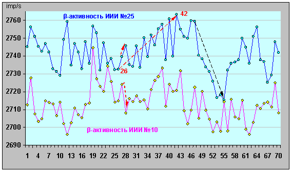 ИИИ № 10 и ИИИ №25 (20.10.07 - 28.12.07). Упомянутая «накачка» (точки 26-42 на графике, рис.39) производилась не каким-либо радиофизическим способом, а была осуществлена упоминавшимся «внешним фактором» естественным образом - за счет искусственного продления периода взаимодействия с ним одной из «подрешеток в системе межатомных связей» 137Cs. Влияние данной серии воздействий на динамику γ-активности ИИИ №25 хорошо видно из сопоставления характеристик γ-активности ИИИ №25 и ИИИ № 10 (рис.40 и 41), где представлены фрагменты, относящиеся к временным периодам: до воздействий на ИИИ №25 (рис.40), и от первого воздействия – до завершения «последействия» (рис.41). Приведенные результаты однозначно подтверждают определяющую роль характера β-излучения в формировании конкретной динамики γ-излучения. (При внимательном рассмотрении рис. 39 и 41 можно заметить, что изменения в динамике как β-, так и γ-активности ИИИ №25 (стрелки на графиках) начались синхронно, спустя 1 сутки после первого воздействия (14.11.07 г.), а это – подтверждение того, что воздействие оказывалось на процесс формирования статуса вещества).
