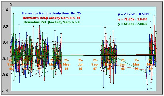 Анализируя полученные результаты можно утверждать, что производившиеся на данном этапе исследований воздействия на ИИИ № 25, действительно влияли не на сам образец, а на течение процессов, формирующих конкретное состояние радиоактивного вещества (точнее, это было взаимодействие с этими процессами). Об этом говорит и итоговый результат (как сумма всех воздействий на образец за весь двухлетний период) – замедление радиоактивного распада ИИИ № 25, что явно демонстрируют отличия параметров трендов относительной γ-активности и производной относительной β-активности ИИИ № 25 – в сравнении с остальными образцами (рис. 42, 43), поскольку именно относительная активность и характеризует изменение скорости радиоактивного распада [1]. Это – подтверждение факта искусственного торможения природного развития процесса радиоактивного распада изотопа 137Cs. (Более подробное рассмотрение взаимодействий такого рода будет проведено в последующих публикациях, посвященных преобразованиям в системе межатомных связей 137Cs при воздействиях на ИИИ, а также методам теоретического анализа взаимодействия системы с упомянутым «внешним фактором»). Рисунок 42. Относительная γ-активность образцов в