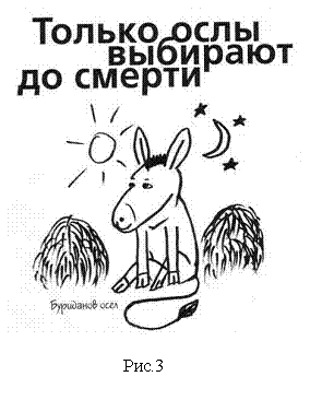 Но на связном неориентированном графе не может быть определено время и, соответственно, движение, ибо каждое состояние связано с двумя соседями, а правило выбора не задано. Связность, хотя и не осмысляема вне времени, не предполагает понятия "следующий". В какую сторону двигаться в кольце состояний? - по часовой стрелке или против? Направо или налево? Ситуация полностью симметрична и мотивированный выбор невозможен. Может ли такое правило само возникнуть внутри замкнутой системы без вмешательства интерпретатора - метанаблюдателя?. На неразрешимость этой ситуации указывал Жан Буридан (XIVвек) в апории "Буриданова осла". На рисунке 3 ослик не может выбрать между двумя охапками сена и рискует умереть с голоду. И, тем не менее, мы знаем, что, так или иначе, выбор всегда делается!. Как же работает этот механизм? Есть целых 3 возможности. Либо 1) нашим миром, в котором до сих пор живы ослы (!), действительно правит случай. 2) либо он (наш мир) управляется извне.  3) либо мы, действительно, обладаем сознанием. Из дальнейшего будет ясно, что в некотором смысле, все 3 возможности являются одним и тем же феноменом, видимым с разных точек зрения.