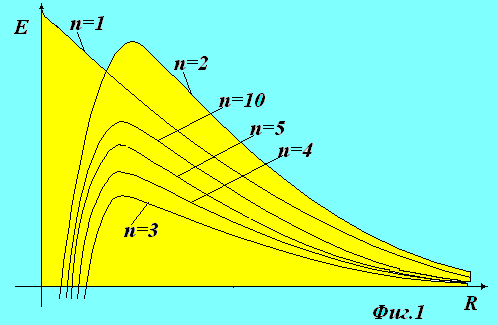 (30) E пот = k Mm R ; …n = 1 (31) где M, m - массы тел, k - константа взаимодействия в n - мерном пространстве. С обычной постоянной Ньютона G она находится через сшивку потенциалов для 3-мерного пространства и соответствующего n - мерного пространства. Тогда для гравитационно взаимодействующих фотонов выражения (29), (30), (31) примут следующий вид (c учетом того, что вместо масс М и m необходимо подставить P/c E пот =- k P2 / c2(n - 2)R n - 2 = - k ћ 2 / c2(n - 2)R2 R n - 2 (29') E пот = k P2 lnR / c 2 = k ћ 2 lnR / c2R2 (30') E пот = k P2 R / c 2 = k ћ 2 / c2R (31') где с - скорость света, ћ - постоянная Планка. В полную потенциальную энергию системы входит и центробежная энергия геона Pj c = N c/ R форма которой, однако, не зависит от размерности пространства, точно также, как не зависит от размерности пространства форма для кинетической энергии «приведенного» фотона E = P' c, где P'=P/2. С другой стороны, центробежная энергия играет роль только в третьем приближении, поэтому далее в выражениях для полной энергии геона в пространствах U n мы не будем ее учитывать (в целях упрощения графиков). Тогда уравнения для полной энергии геона в пространствах U n будут иметь вид (при условии, что ( k = c = ћ = 1). E (R) = ( 1-2 / (n -2) Rn - 1) / 2R ; n ³ 3 (32) E (R) = ( 1+ 2 lnR / R) / 2R ; n= 2 (33) E (R) = 1,5 / R ; n= 1 (34) Обратим внимание на то, что на графиках зависимости энергии геона от R (см.[3]) точка максимума является характерной точкой, лежащей в области энергий Eпл = 1019 Гэв. Именно в ней начинается "падение" фотонов на гравитирующий "центр" и образование планковской черной дыры. Построим графики зависимости полной энергии геона E (R) в пространствах с размерностями 1,2,3,4,5,.....,n в соответствии с соотношениями (32), (33), (34) (см.фиг.1).