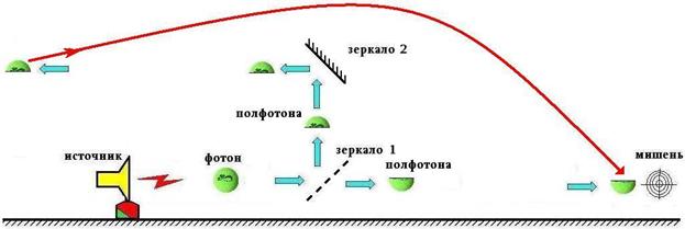 через полупрозрачное зеркало (расщепитель) он как бы оказывается одновременно в