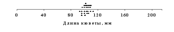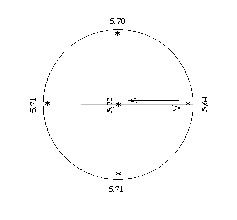 Такие опыты воспроизводятся почти со 100% вероятностью. На рис. 1, внизу показано графическое отображение 13 опытов (точками отмечено положение бугорков осадка гомогената в присутствии предмета, треугольники – в его отсутствии), которое свидетельствует о практически полном совпадении положения бугорков осадка в присутствии и отсутствии предмета рядом с кюветой. Напомним, что, при изначальном отсутствии предметов рядом с кюветой положение бугорков осадка по длине кюветы распределяется в соответствии с принципом золотой пропорции. При таком распределении появление бугорков осадка в центре кюветы маловероятно [13]. В опытах с пространственной неоднородностью воды в центре стеклянного сосуда и у его стенки [15] выяснилось, что разность рН в центре сосуда и у его внутренней поверхности стенки увеличивается по мере увеличения времени пребывания электрода рН-метра у стенок сосудов. Из рис. 2 видно, что наибольшая разность между центром сосуда и у его стенки была там, где электрод помещался многократно (стрелки). При одноразовом помещении электрода в другие точки у стенки сосуда регистрировалась минимальная разница рН (рис. 2). Складывается впечатление, что в месте многократного пребывания электрода эффект его воздействия на воду суммируется с остаточным фантомным образом электрода, какое-то время сохраняющимся в этом месте у стенки сосуда, что и приводит к увеличению разности рН воды между этой точкой и центром сосуда. Рис. 2. Фантомный эффект электрода рН-метра на рН воды у внутренней стенки сосуда. Пояснения в тексте.